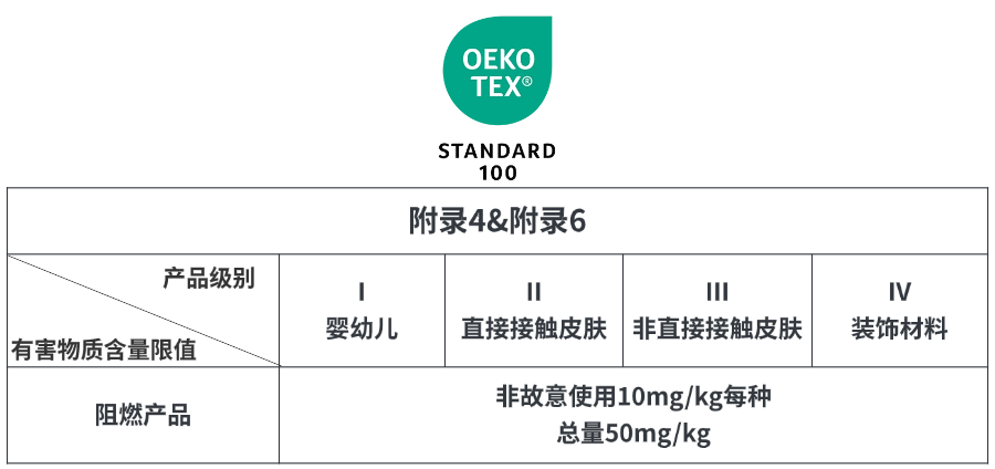 海恩斯坦可通过OEKO-TEX® STANDARD 100认证为产品进行全面的有害物质检测,针对纺织品中阻燃剂的含量STANDARD 100认证提出了更加严格的限量值要求。
