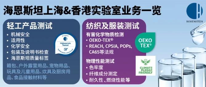 海恩斯坦,源自德国,成立于1946年,是OEKO-TEX®协会创始人及标准制定者,也是国际抗紫外线应用检测协会创始人,同时还是RAL-GZ 992官方发证机构及PPE个人防护用品的欧洲公告机构(0555号)。作为国际认可的检测实验室、认证和研发机构,海恩斯坦服务范围已涵盖至纺织品、轻工产品、卫生医疗等领域的专业技术和跨学科研究,可提供广泛的功能性测试、有害物质检测、生物相容性等医学测试及各类功能性认证等。